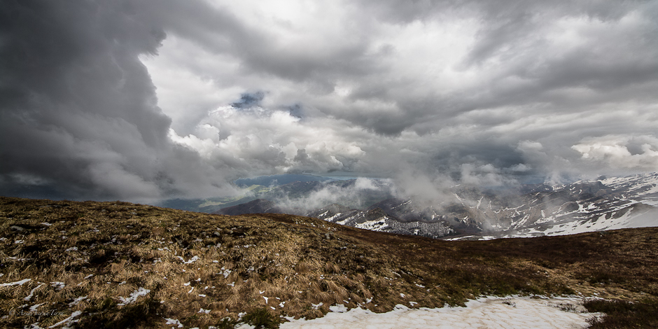 Sono sulla cresta e dalla Lunigiana vedo grandi masse d’aria che avanzano verso di me. In poco le nuvole si scontrano con il ripido pendio poche centinaia di metri sotto la mia posizione e carambolano in verticale velocemente.E’ la genesi di un temporale, rimango totalmente affascinato a guardare la colonna d’aria che si rimescola, si scurisce, brontola ed in poco scarica la sua furia.
