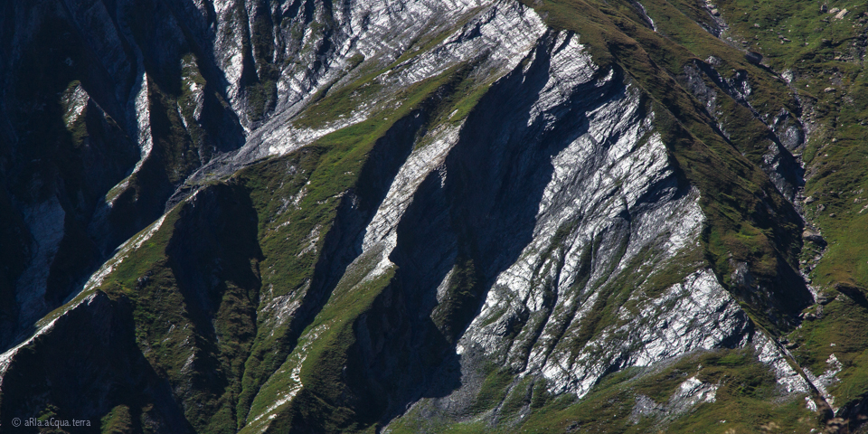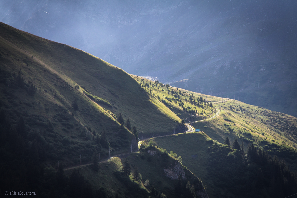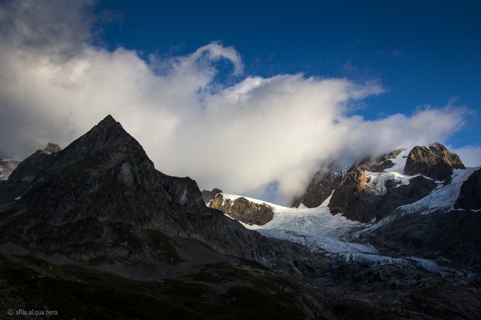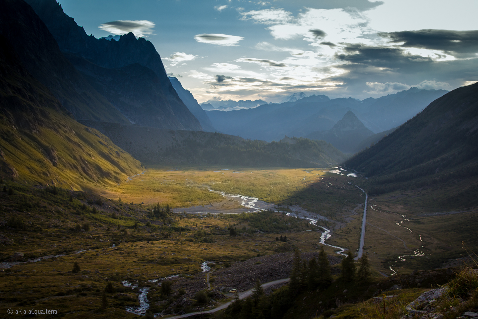 Inizio la lunga discesa verso Argenterie, dopo poco mi blocco per ammirare il paesaggio che fà capolino tra le nuvole, è tutto molto dinamico e vivo……colpi di sole, poi diventa scuro…..cielo azzurro, giochi di ombre….spunta la valle!! Guardo tutto aumentando il mio archivio di immagini uniche.