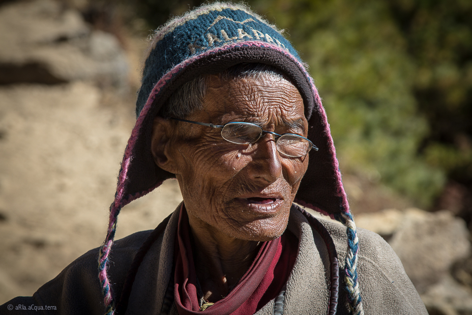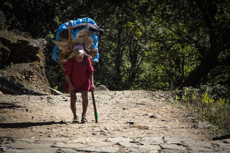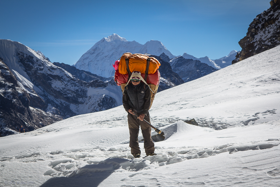 Mi fermo a prendere fiato appoggiandomi ad un cumulo di pietre….nel silenzio rarefatto si sente un lento rumore di passi. Il portatore sherpa spunta dalla boscaglia con il suo carico impossibile di materiale, curvo di schiena….guardandolo anche le sue gambe sembrano incurvate dal peso e dai chilometri; ha un età indefinita, si ferma vicino a noi guarda in alto e le montagne gli si riflettono negli occhi, sorride e come rigenerato da un energia invisibile parte di nuovo sotto il suo carico, su per la lunga ed estenuate salita.
