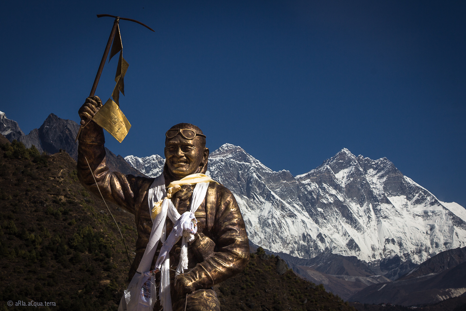 Sotto la sua statua con una bellissima vista sulla montagna più alta del mondo si rievocano storie di valanghe, crepacci profondissimi e venti gelidi….mentre ti raccontano le loro avventure a 8000 metri le parole trasudano vertigini;sono gli sherpa arrampicatori i protagonisti sconosciuti del grande alpinismo d’alta quota, negli anni si sono guadagnati l’appellativo di “tigri delle nevi” per il loro coraggio e abilità sui pendii verticali delle montagne più alte del mondo.