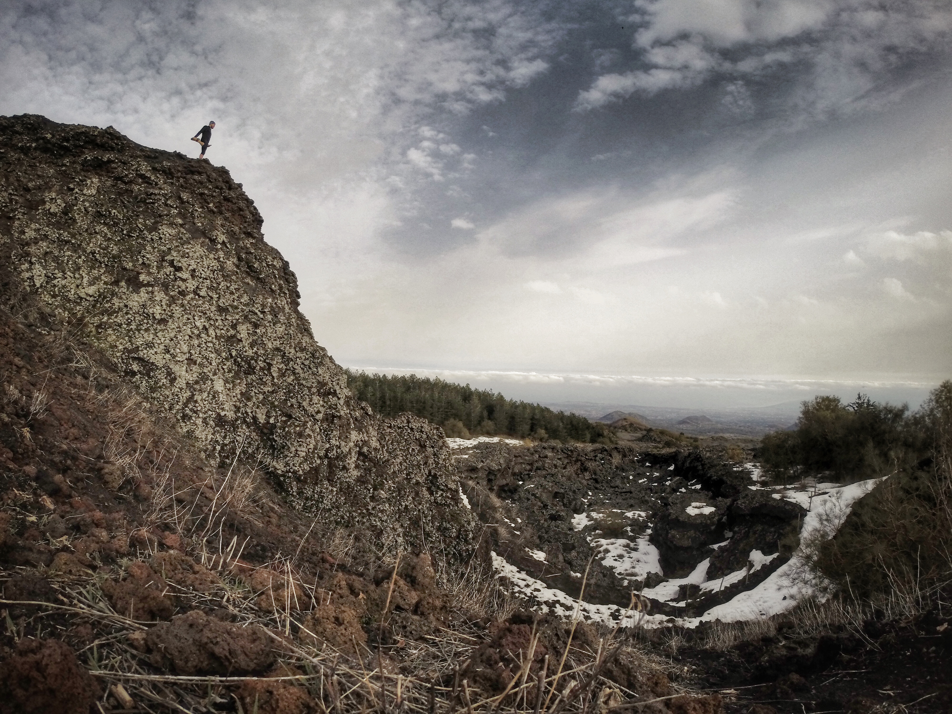 Il Trail parte sopra il paese di Nicolosi e si snoda tra il Monte Gemmellaro e il Monte Grosso; che vengono definiti monti ma sono in realtà vecchi crateri ormai principalmente coperti da alberi di castagno. E’ molto faticoso correre su questo suolo friabile ed anche il grip delle scarpe non è il massimo ma lo scenario anomalo ripaga ampiamente.